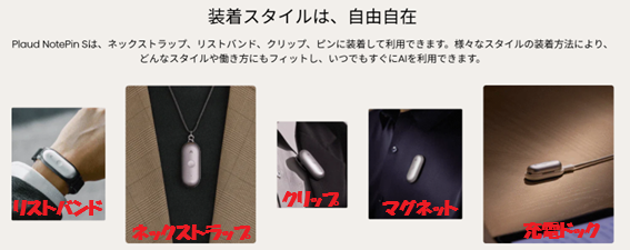 Plaud NotePin Sは、利用シーンに合わせた4種類のアクセサリーが標準で同梱されています。このアクセサリーって、本題からあまり関係ないようですが、そうではありません。これらが、Ploud NotePin Sの特化された速攻録音という機能を可能にしています。ちなみに私はペンダントのようにして使っています。録音がすぐできます
